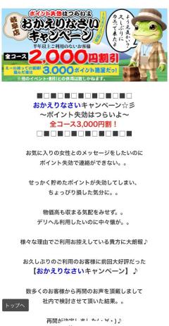 毎日ヘブン様でいいね押してくれてるお兄さんがいますきとみの日記いつも見てくれてありがとうございます半年以上ご利用がない方で4月末までにご利用いただくと3000円割引しますよぉ詳しくはお店にお問い合わせかホームページをご覧下さいお久しぶりのお兄さんもしよければこの機会にどうでしょう?きとみ
