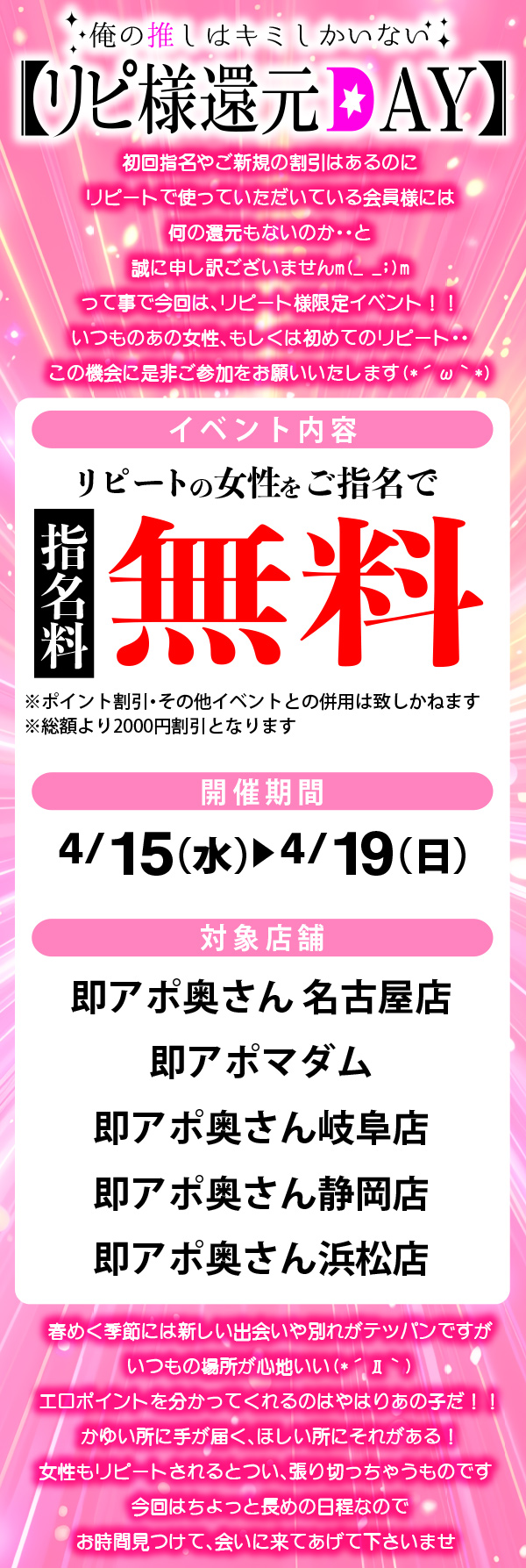 リピート様は指名料無料(2,000円割)