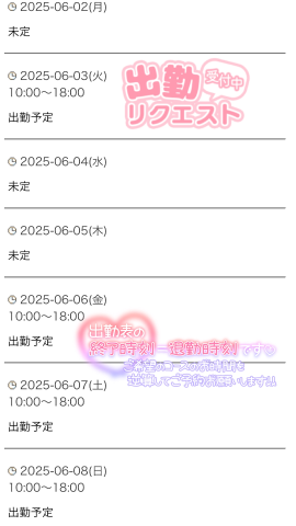 先日遊んでくださったお兄さん今回もクチコミ書いてくれてありがとうございますまたお会いできるの楽しみにしてますね今週のシフト載せておきますね3日 10時〜18時4日、5日 未定ですが明日出勤挙げる予定です何も無ければ10時〜18時出勤予定6日〜8日 10時〜18時まだ空きございますのでお気軽にお声掛けてくださいねメッセージくださってありがとうございますきとみとお会いする予定のお兄様達と会えるといいなーきとみ