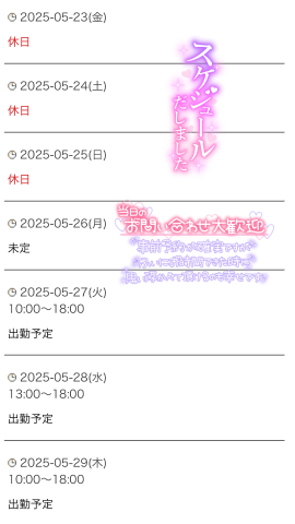 皆さんこんにちは来週のスケジュール更新しましたお時間合いましたらご予約お待ちしてます23日〜25日までお休み27日 10時〜18時16時〜18時10時〜15時28日 13時〜18時14時〜15時20分16時〜18時29日 10時〜18時当日まだ空きございます26日未定ですが出勤できる可能性出てきましたお気軽にお問い合わせお願いしますーきとみ