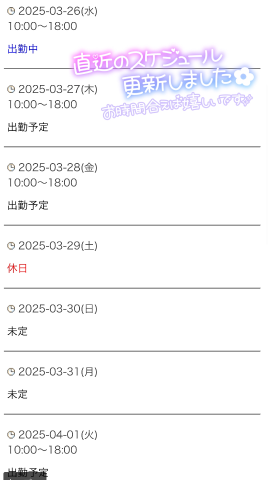 本日お休みをいただきました急にお休みしてすみませんクチコミありがとうございます明日は10時〜18時出勤予定ですお時間合う方いましたらお誘いお待ちしておりますきとみ