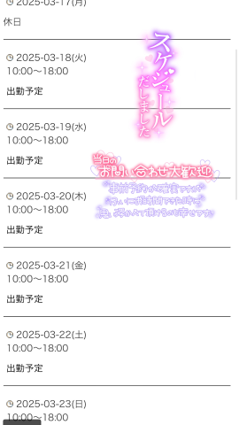 皆様お疲れ様です退勤しましたラスト枠で遊んでくれたお兄さんありがとう次回は18日10時から18時まで出勤予定です明日出勤できそうならお知らせしますきとみ