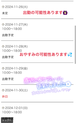 皆様こんにちは本日はおやすみをいただいておりますスケジュール確定しましたので、お知らせいたします次回出勤予定11月26日 未定となっておりますが、10時〜18時出勤予定に変更するかも11月27日 10時〜18時出勤予定11月28日 お休みに変更予定(後日お知らせします)11月29日 10時〜18時出勤予定11月30日 お休み12月1日 10時〜18時(時間は決まってませんが、1件ご予約予定あります)以上となります予約の打診などございましたら、ご対応しますのでお気軽に問い合わせされても大丈夫ですなにかあればお気軽にお問い合わせくださいねきとみ