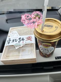 お礼日記あげるの遅くてすみません10月27日12時10分頃ご予約いただいたG様から差し入れのお礼を申し上げます今回は以前メールでお話していた通り、栗粉餅とチョコレートティーラテをいただきました栗粉餅で水分持っていかれましたでもとても美味しかったです栗きんとんとは違った味でしたチョコレートティーラテのチョコレートは意外とあっさりしていて飲みやすかったです次回も差し入れ期待してますねきとみ