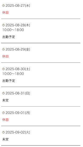 みなさんこんにちはいかがお過ごしでしょうか今週のシフト出来ましたのでお知らせします8月28日 10時〜18時まで29日 お休み30日 12時〜18時まで(後日時間変更予定)31日 未定(午前中のみ時短出勤の可能性あり)9月のシフトは調整中ですわかり次第またお知らせしますねきとみ