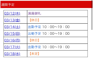 みなさんこんばんはお仕事お疲れ様でした退勤させていただいております今週のシフト出来たのでチェックしてね事前のお問い合わせ大歓迎です明日お休みです休日予定でも事前にお問い合わせくだされば出勤できる可能性おおいにありますので遠慮なくお申し付けくださいね?