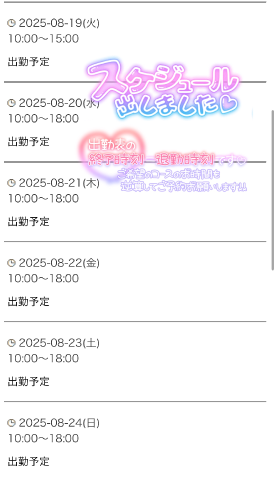 みなさんこんばんは本日からお仕事始まった方もいるのではないでしょうか?長期休暇で気だるいですよねきとみでよければ日頃の疲れを癒して差し上げますよさて、今週のシフト出来ましたのでお知らせしますお時間合いましたらお誘いくださると嬉しいですおやすみなさいきとみ