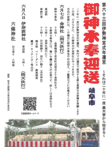 本日は、岐阜からスタートです事前のご予約ありがとうございます天気か良くて窓を開けると気持ちがよい風最高のエッチ日和ですねお越しの際は、安全運転でお越しくださいね6月7日(土曜日)御神木奉迎送が岐阜市にくるよ20年に一度の大大大イベント伊勢神宮まで御神木が旅します興味がある貴方さまは、是非行ってみてね神輿もでるよ夜は金神社にて、夜まつり17時から屋台がでるよ本日もお付き合いくださいねよろしくお願い致します