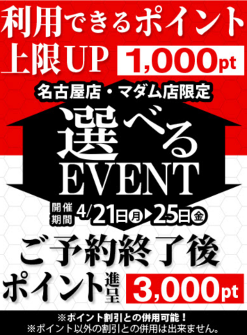 イベントのお知らせ▼内容?ポイント利用上限UP(いつもより+1,000PT多く利用可能)?終了後3,000PTプレゼント※ご予約の際?or?どちらかお選び下さい。※ポイント併用可能(他イベント併用不可)▼期間 4/21(月)〜4/25(金)▼対象 即アポ奥さん-名古屋即アポマダム-名古屋 事前ご予約リクエスト出勤受付中メッセージ又は、スタッフまでお問い合わせください今日も頑張りましたねお疲れさまでした日曜日は、いかがお過ごしでしょうか楽しいひとときを過ごせましたか明日に備えて今夜は、ゆっくりカラダを休めてくださいね日程、時間をメッセージにて早めに教えてくださりと助かりますよろしくお願い致します