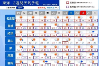 今週の東海地方は、かなりの高温が続き、名古屋や岐阜では、40℃以上の酷な暑さとなる日もありそうです。熱中症リスクが高い状態が続きます。災害級の暑さに警戒してください。2025.8月19日(火)今日は熱中症アラート出てますね。水分塩分補給して、熱中症防止して生きましょう本日は、急遽お休みになりました皆さんも熱中症に注意して対策をしてお出かけくださいね。また更新します