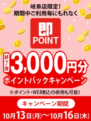 対象店舗】 即アポ奥さん~岐阜店~ 【期間】 ・10/13(月)~10/16(木) 【内容】 ご予約終了後に3,000ポイントポイント進呈 ポイント・WEB割併用可 お得にお遊びしてくださいね