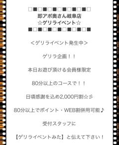 本日お遊び頂ける会員様限定80分以上のコースで!!日頃感謝を込め2,000円割☆彡80分以上でポイント・WEB割併用可能♪受付スタッフに【ゲリライベントみた】と伝えて下さい!気まぐれで発動するゲリライベントをみ の が す な !※本日18時までの開催となります※良かったらおにしてくださいね18歳未満または高校生のご利用はお断りいたします。